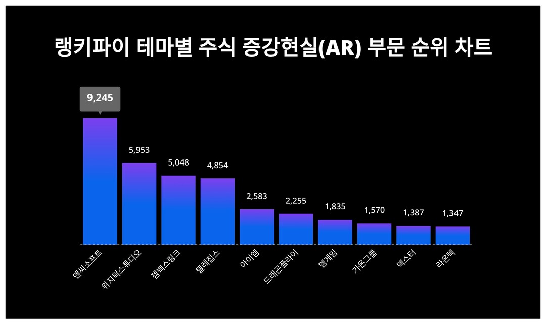1위 엔씨소프트 주가·2위 위지윅스튜디오 주가·3위 젬백스링크 주가, 3월 3주차 테마별 주식 증강현실(AR) 부문 트렌드지수 순위 발표