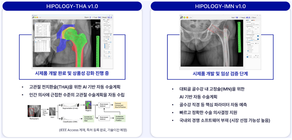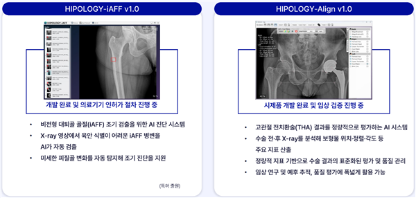 그 결과가 'HIPOLOGY 시리즈'다. HIPOLOGY-THA, HIPOLOGY-iAFF, HIPOLOGY-IMN, HIPOLOGY-Align으로 구성된 확장형 제품군으로, 정형외과 진료 전 과정을 하나의 AI 플랫폼으로 통합한다. HIPOLOGY-iAFF는 X-ray 영상에서 육안으로 구분하기 어려운 미세한 대퇴골 골절 병변을 조기에 자동 검출하는 진단 솔루션이며, HIPOLOGY-THA와 HIPOLOGY-IMN은 각각 고관절 전치환술과 대퇴골 골수강 내 고정술을 위해 보형물 크기와 핵심 수술 파라미터를 AI가 자동으로 산출해 수술 계획을 지원한다. 여기에 HIPOLOGY-Align이 수술 후 보형물의 정렬과 각도를 정량적으로 분석해 결과 평가와 품질 관리를 담당함으로써, 진단부터 수술, 사후 관리까지 단절 없는 임상 워크플로를 완성해낸다.