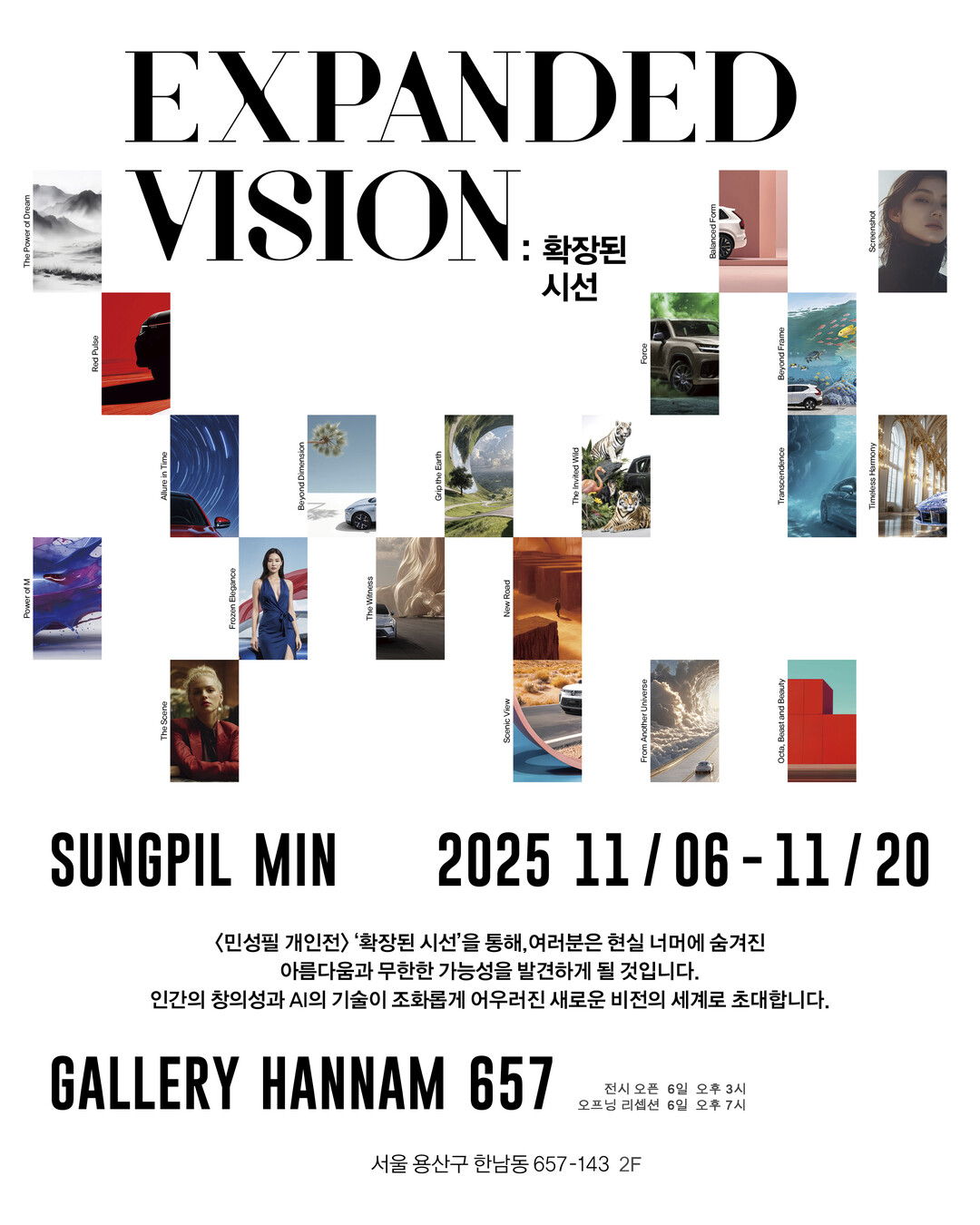 20년간 자동차 전문 사진작가로 활동하며 수많은 이야기를 렌즈에 담아온 민성필 작가가 오는 11월 6일(목)부터 11월 20일(목)까지 서울 용산구 한남동 갤러리 한남 657에서 개인전 <EXPANDED VISION : 확장된 시선>을 개최한다. 이번 전시는 인공지능(AI)과의 혁신적인 협업을 통해 인간의 제한된 표현력을 창의적으로 확장하고, 사진 예술의 새로운 가능성을 탐구하는 뜻깊은 자리다.