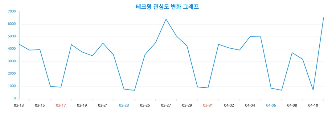 이번 분석을 통해 얻어진 테크윙에 대한 일간 변화 추이 차트는, 테크윙에 대한 관심이 어떻게 변화했는지를 생생하게 드러낸다.