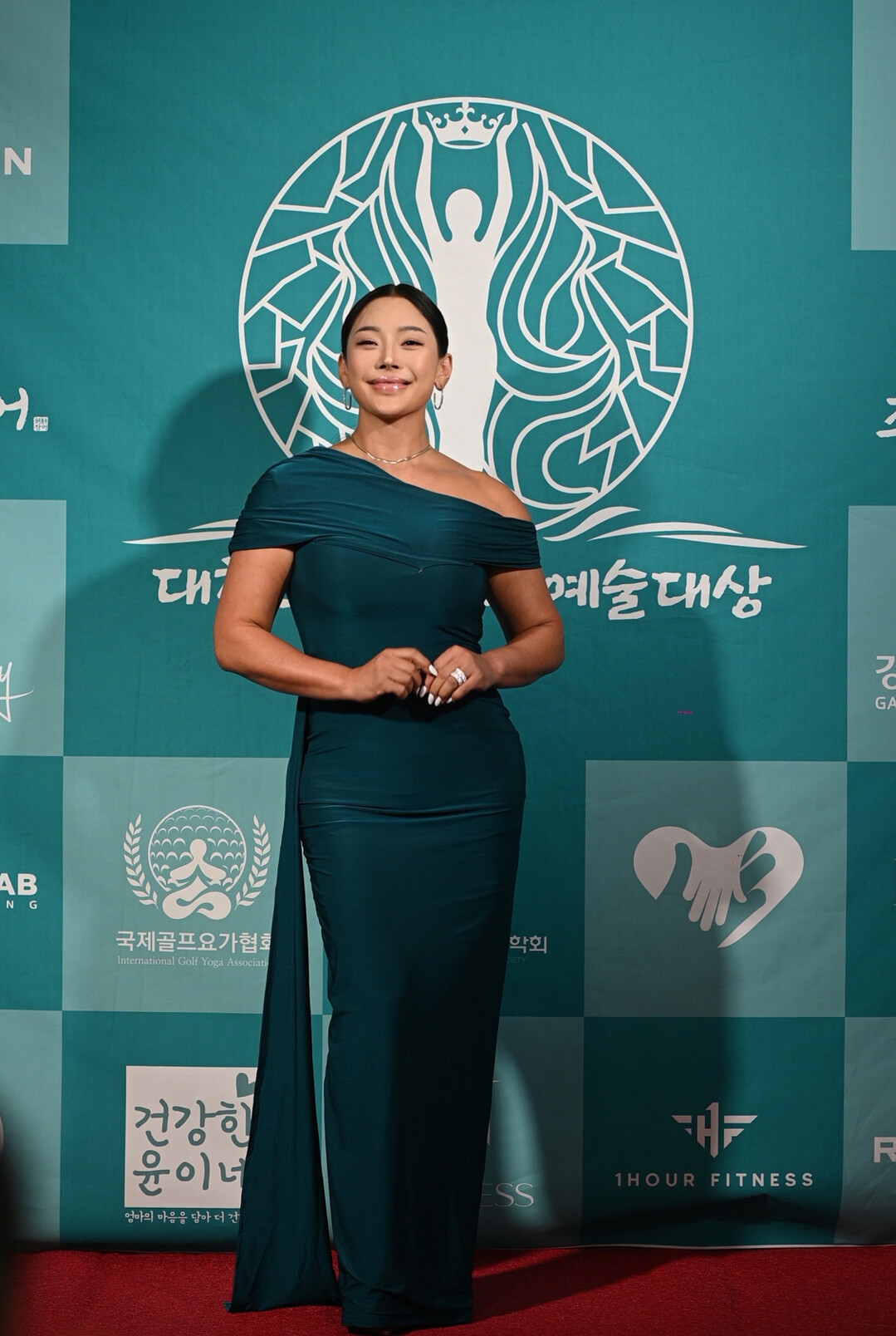 '피지컬: 100'에 출연한 피트니스 모델 이소영이 12일 경기도 성남시 동서울컨벤션센터에서 진행된 '제3회 대한스포츠문화예술대상'에 참석, 포즈를 취하고 있다.