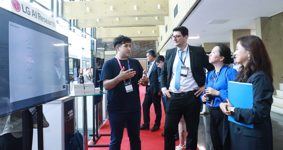 ▲유네스코 관계자들이 지난 22일 서울 한국과학기술연구원에서 진행한 AI 서울 정상회의에서 LG의 AI 기술에 대한 설명을 듣고 있다. 사진=LG