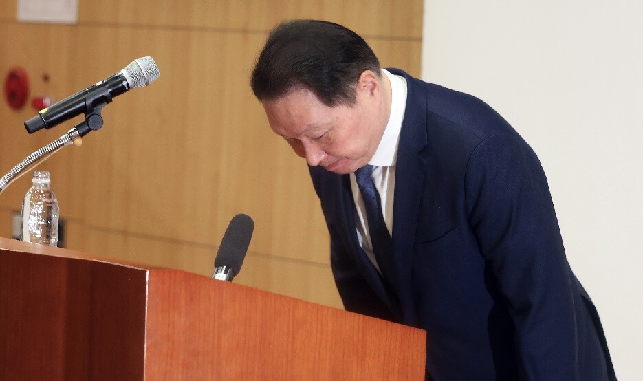 | ▲최태원 SK그룹 회장이 지난 17일 서울 종로구 SK서린빌딩에서 최근 재판 현안과 관련해 고개 숙여 사과했다. 사진=SK |