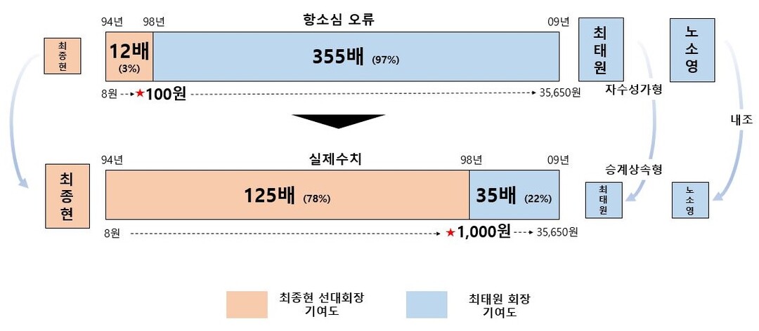항소심 재판부는 최 회장이 1994년 11월 인수한 대한텔레콤의 주식 가치를 산정하는 과정에서 계산 실수했다. 최 회장이 취득할 당시엔 주당 8원, 최종현 선대회장 별세 직전인 1998년 5월 주당 100원, SK C&C가 상장한 2009년 11월 주당 3만5650원으로 각각 계산했는데 "두 차례 액면분할을 고려하면 1998년 5월 주식 가액은 주당 100원이 아닌 1000원이 된다"는 게 최 회장 측의 설명이다. 이를 근거로 대한텔레콤 가치 증대 기여도 계산 역시 잘못됐다고 주장했다. 최종현 선대회장 시기(1994.11~1998.5)는 12.5배에서 125배로, 최 회장의 시기(1998.6~2009.11)는 355배에서 35.5배로 봐야 한다는 것이다.