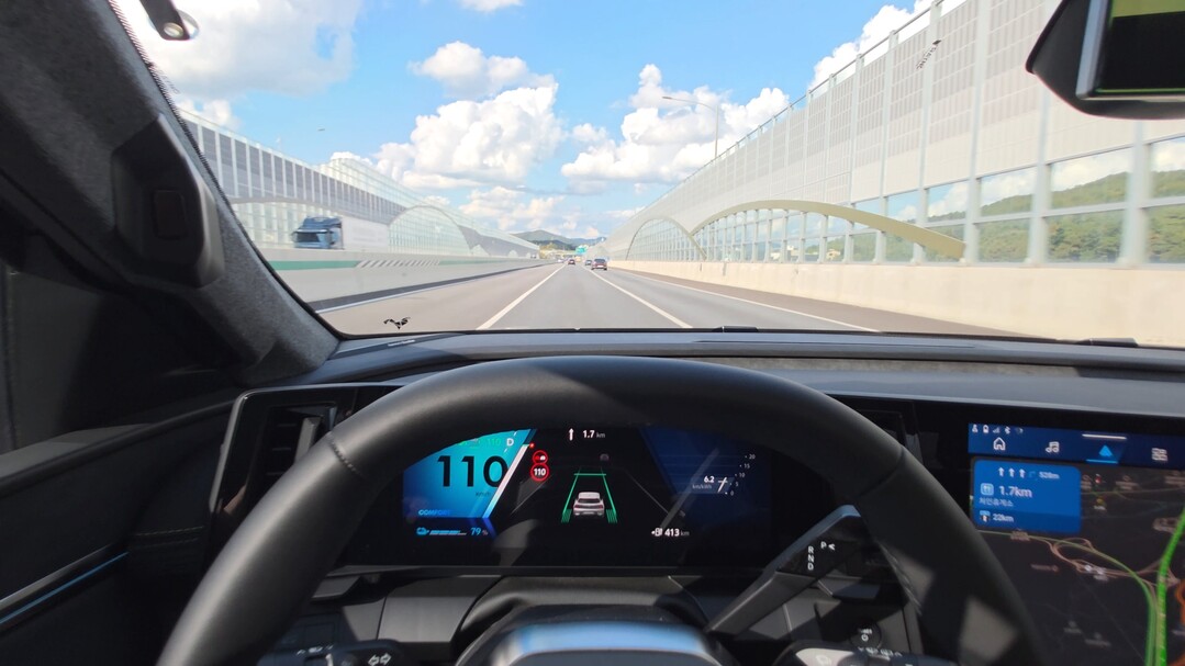 고속도로에 진입하자 르노 세닉 E-Tech의 진정한 안정감이 드러났습니다. 차체 하부에 통합된 87kWh 배터리 덕분에 무게 중심이 낮게 형성되어 고속에서도 차체 흔들림이 거의 없고, 마치 노면에 착 가라앉는 듯한 단단한 승차감이 일품입니다.