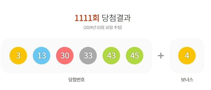 | 16일 제1111회 동행복권 로또 추첨 결과 '3, 13, 30, 33, 43, 45'이 1등 당첨 번호로 결정됐다. 2등 보너스 번호는 '4'이다. 사진=동행복권 홈페이지 캡쳐 |