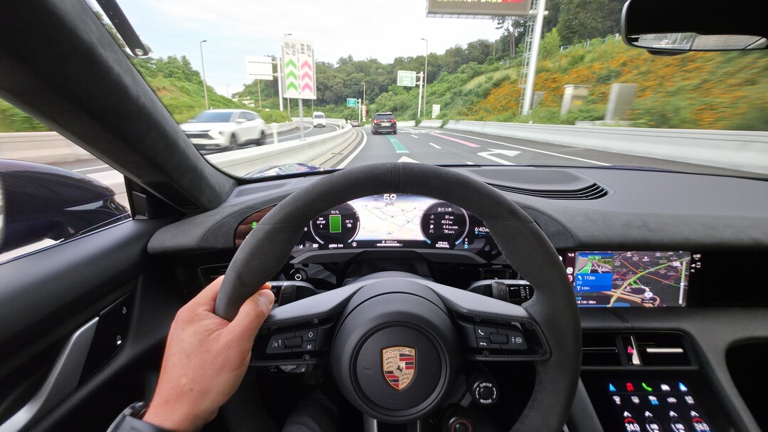 온몸을 꽉 잡아주는 느낌을 받습니다. 시동 버튼을 누르면 요란한 엔진음 대신 미래적인 '징~' 하는 전자음과 함께 차가 깨어납니다. 여기서 고성능 내연기관 포르쉐의 엔진음과 배기음에서 오는 감성적인 만족감은 기대하기 어렵다는 점은, 순수 전기차만이 가질 수밖에 없는 숙명적인 단점이겠지요.