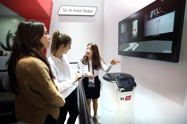 KT는 스페인 바르셀로나에서 열리는 MWC 2019에서 5G AI 호텔 로봇 서비스를 선보인다고 26일(현지시간) 밝혔다. MWC 2019에서 공개 된 AI호텔로봇은 실제로 인공지능(AI) 호텔에서 구현될 예정이다. KT는 AI호텔인 동대문 노보텔 앰배서더 호텔에서 연내 5G AI호텔 로봇 서비스를 시작한다.