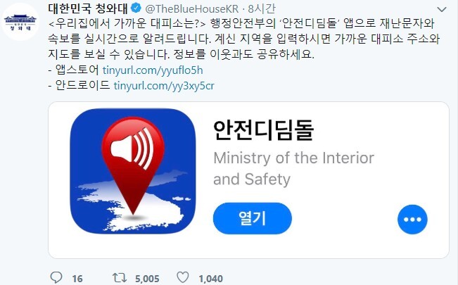 또 정부 공식 계정(@hellopolicy), 청와대(@TheBlueHouseKR), 속초시청(@dreamsokcho), 산림청(@forest_news), 소방청(@safeppy), 경찰청(@polinlove) 등 유관기관 계정에서도 실시간 속보 및 산불 대피 요령, 재난문자와 속보를 받을 수 있는 앱 안내 등 주요 정보들을 트윗했다.