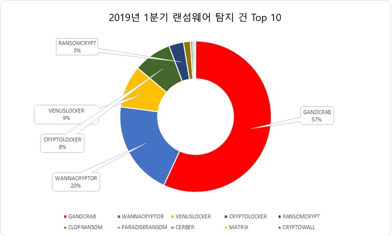 올해 1분기 랜섬웨어 탐지 건수는 직전분기(2018년 4분기) 대비 84% 증가했다. ‘갠드크랩’이 전체 탐지건수의 57%를 차지하며 올해 1분기에 가장 많이 탐지된 랜섬웨어로 나타났다. 이어 ‘워너크라이(20%)’, ‘비너스락커(9%)’, ‘크립토락커(8%)’가 뒤를 이었다. 특히 ‘갠드크랩’ 계열 랜섬웨어는 직전 분기대비 탐지건수가 약 77% 증가해 국내에서 가장 활발하게 활동하는 랜섬웨어로 나타났다.
