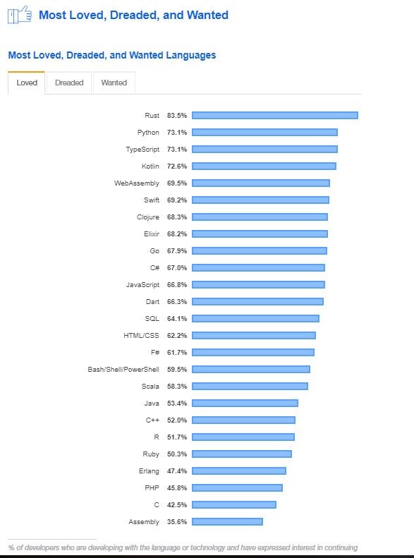 4년 연속 Rust가 83.5%의 개발자를 보유하고 있는 언어로 1위를 차지했다 밝혔다. 이어 Python(73.1%), TypeScript(73.1%), Kotlin(72.6%) 순으로 나타났다.