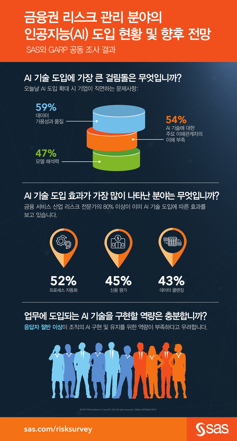 계적인 분석 선두 기업 SAS가 국제재무위험관리전문가협회(GARP, Global Association of Risk Professionals)와 발표한 ‘금융권 리스크 관리 분야의 인공지능 활용’ 보고서에 따르면, 금융 서비스 산업 분야의 리스크 전문가 81%가 이미 인공지능(AI) 기술 도입에 따른 효과를 보고 있는 것으로 나타났다고 24일 밝혔다. 이번 조사는 2018년 12월 한국을 비롯한 전세계 금융 서비스 산업 종사자 중 리스크 관리 업무 담당자 2000명 이상을 대상으로 실시했다.