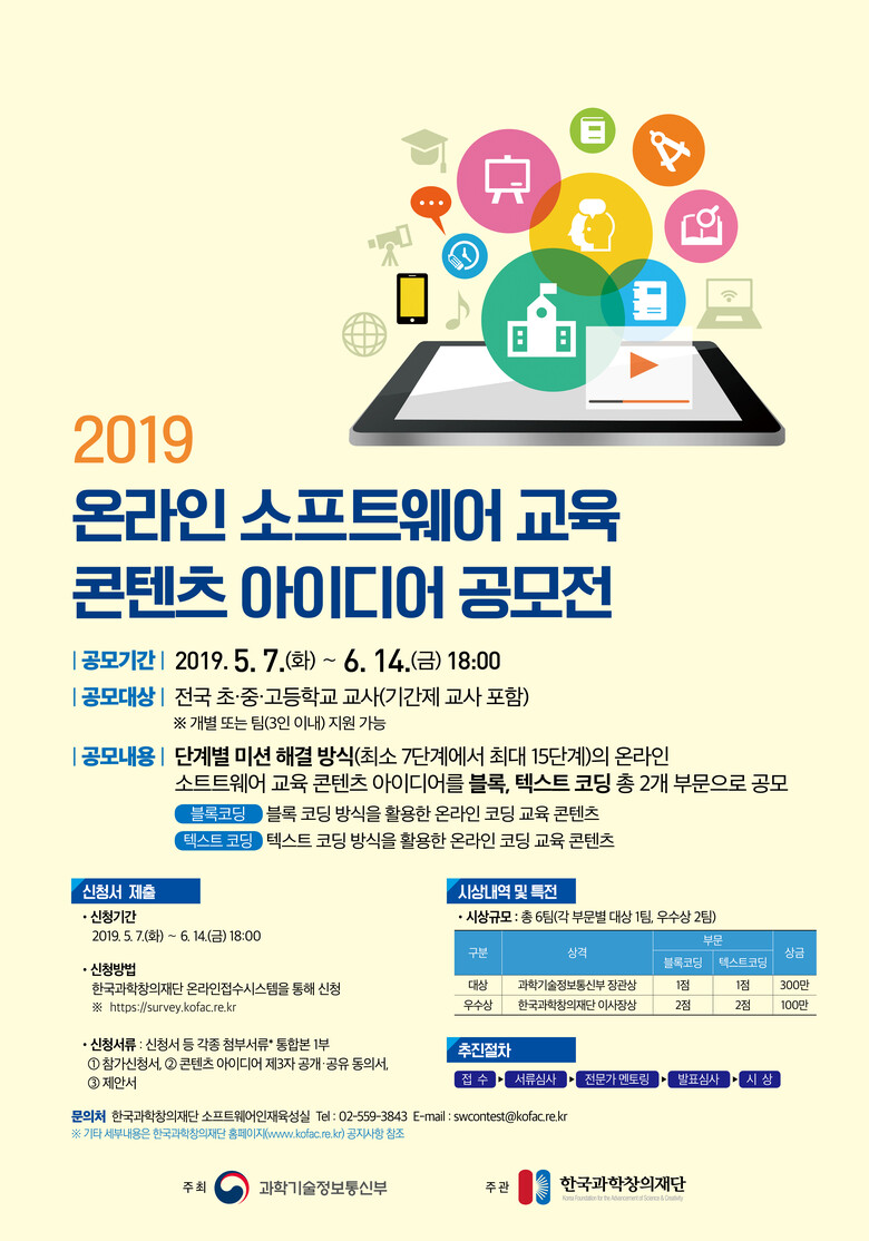 과학기술정보통신부(장관 유영민)는 5월 7일부터 6월 14일까지 ‘2019 온라인 SW(소프트웨어) 교육 콘텐츠 아이디어 공모전’을 개최한다고 밝혔다.
