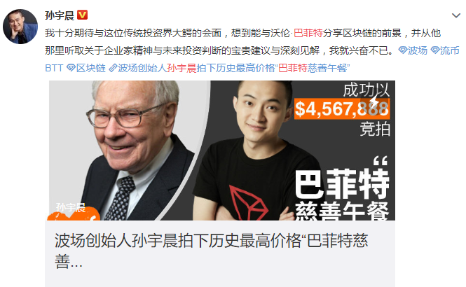암호화폐와 블록체인 업계의 대표 주자이며 인플루언서인 저스틴 선(Justin Sun, 孙宇晨) 트론(TRON, TRX) 창업자 겸 최고경영자(CEO)가 '투자의 귀재' 워런 버핏(Warren Buffett, 巴菲特) 버크셔 해서웨이(Berkshire Hathaway) 회장과 점심식사를 하는 자선 경매에 당첨됐다.