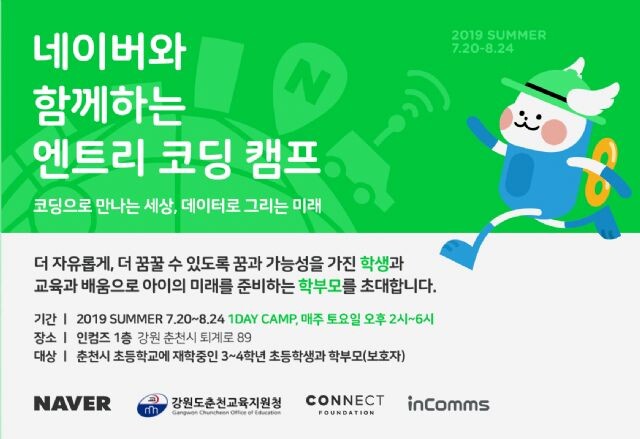 춘천교육지원청과 함께 진행하는 이번 교육 프로그램은 내달 24일까지 매주 토요일마다 운영되며 지역 초등학생과 학부모의 신청을 받아 네이버 자회사 인컴즈에서 진행된다.
