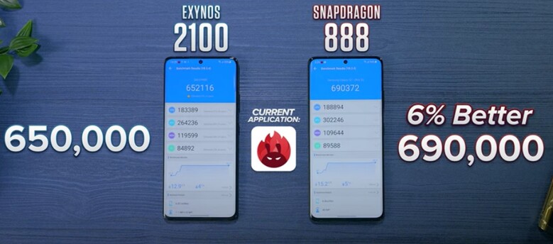 실제로 벤치마크 사이트인 안투투(AnTuTu)의 엑시노스 2100 버전 갤럭시 S21 울트라는 총점 65만 점을 받았다. 스냅드래곤 888버전 갤럭시 S21 울트라는 총점 69만 점을 받아, 엑시노스 버전보다 6% 더 우수하다는 결과가 더 나왔다.
