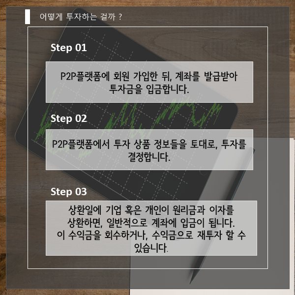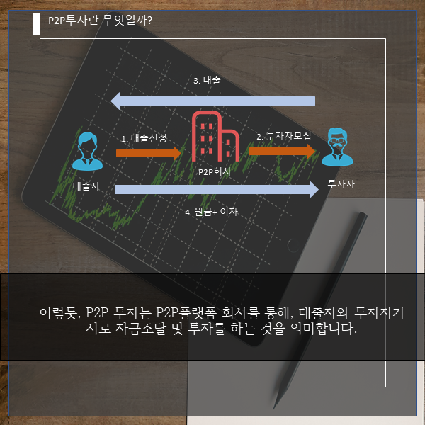 요즘 금융과 IT 기술을 접목한 새로운 금융 형태인 핀테크가 주목받고 있습니다. 대표적인 핀테크 사례 중 하나인 P2P투자에 대해 카드뉴스로 소개합니다.