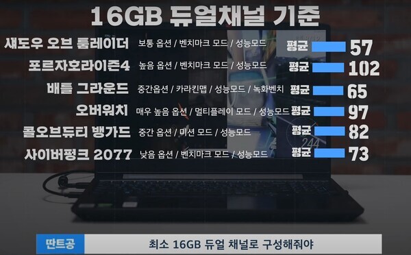 그는 "기본 옵션으로도 옵션 타협만 잘하면 게임을 돌릴 수는 있다. 하지만 포르자 호라이즌4, 오버워치, 배틀그라운드, 콜오브튜디 뱅가드, 사이버펑크2077 등 고사양 게임들을 실제로 테스트해본 결과 최소 16GB 듀얼 채널로 구성해줘야 게임을 원활하게 플레이할 수 있다"고 강조했다.