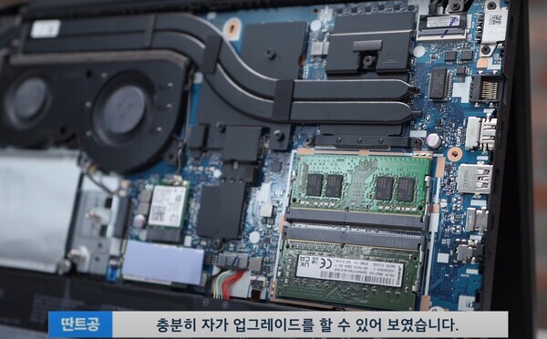 이 제품은 하판에 연결된 나사를 제거한 후 분리해주면 여분의 슬롯에 램과 SSD를 추가 장착할 수 있다. 이에 딴트공은 기본 스펙인 8GB 램 외에도 8GB 램을 하나 더 추가해서 8GB 싱글채널 램일 때와 16GB(8GB+8GB) 듀얼채널 램일 때의 성능을 비교했다.