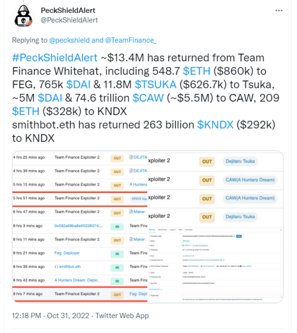 해커는 548.7 ETH를 FEG에, 76.5만 DAI 및 1,180만 TSUKA를 Tsuka에, 500만 DAI 및 74.6만 CAW를 CAW에, 209 ETH를 KNDX에 반환했다.