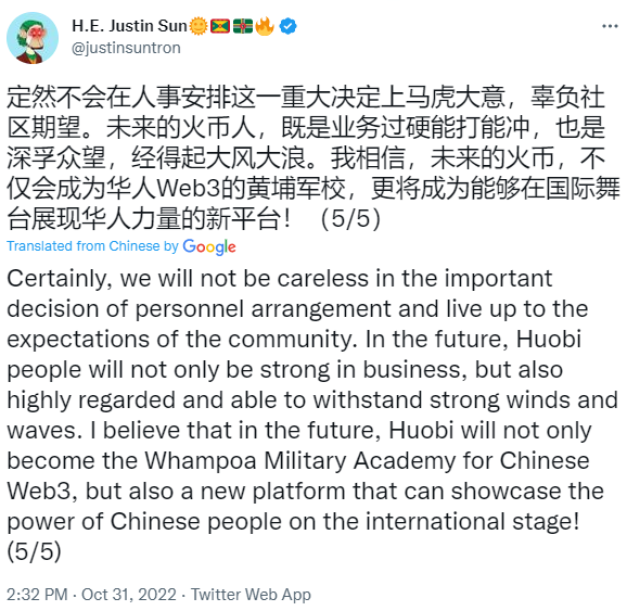 31일(현지시간) 저스틴 선은 트위터를 통해 "인사 배치의 1순위는 암호화폐의 미래 성장에 초점을 두고 있으며 이를 위해 후오비 안팎의 의견과 각 실무자들의 목소리를 취합하고 있다"고 전했다.