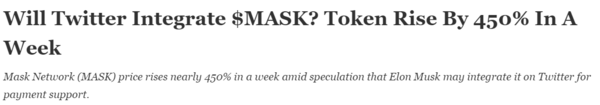 3일(현지시간) 코인게이프는 "최근 마스크네트워크(MASK)의 MASK 가격 급등은 트위터에서 MASK 토큰이 결제 수단으로 추가될 수 있다는 '추측성 소문'이 확산되고 있는 영향"이라 보도했다.