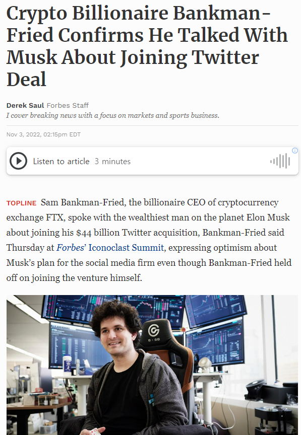 FTX 창업자가 "트위터에 대한 일론 머스크 테슬라 CEO의 비전은 나와 맞지 않았고, 또 인수 과정에서 내가 별도로 보태줄 수 있는 일이 없었기 때문에 인수에 우리가 참여하는 것이 바람직하지 않았고 판단했다"고 밝혔다.