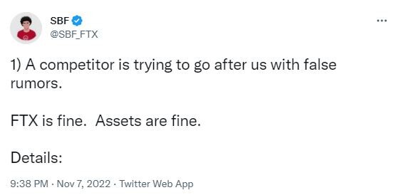 FTX 창업자가 "경쟁사가 거짓 루머로 우리를 뒤쫓고 있지만 FTX는 괜찮다"고 밝혔다.