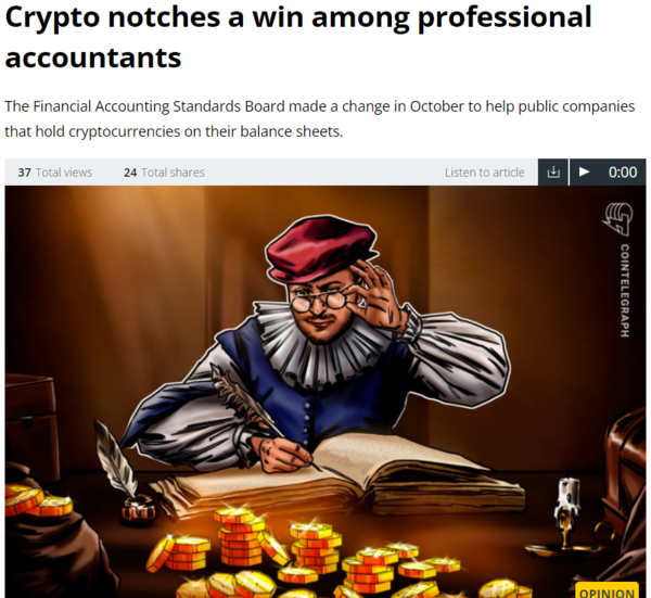 미디어는 "하지만 이번 규칙 변경으로 기관 투자자 등은 다른 자산에 적용하는 '공정가치 회계규칙'을 암호화폐에도 적용할 수 있으며, 공개된 자산 가격을 대차대조표에 입력할 수 있다"고 설명했다.