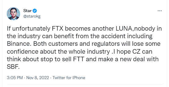 그는 "자오창펑 바이낸스 최고경영자(CEO)가 FTT 매도를 중단하고 샘 뱅크먼 프리드(SBF)와 새로운 계약을 맺을 수 있길 바란다"고 덧붙였다.