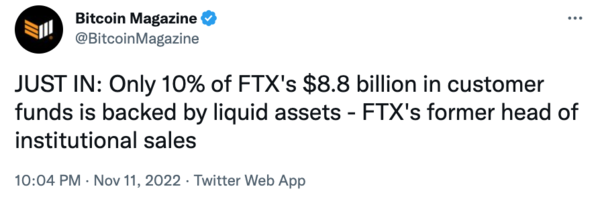 전 FTX 기관영업 총괄 제인 타켓(Zane Tackett)이 FTX의 88억달러 고객 자금 중 10%만이 유동자산으로 뒷받침된다고 폭로했다. 유동자산은 현금·예금·주식·사채 등의 유가증권을 말하며, 어느 것이나 다른 재화와 쉽게 바꿀 수 있을 뿐 아니라 다른 자산 대비 그 가치가 안정되어 있는 것을 말한다.