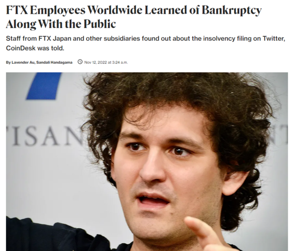 12일(현지시간) 코인데스크는 "11일(현지시간) FTX는 미국 법원에 챕터11 자발적 파산을 신청했지만, 신청 서류에 언급된 134개 계열사 모두가 이를 알고있지는 못했다. 전세계 각지에 퍼져있는 FTX 계열사 직원들은 사전에 소식을 듣지 못했고, 대중들과 동시에 이러한 소식을 인지한 것으로 알려졌다"고 설명했다.