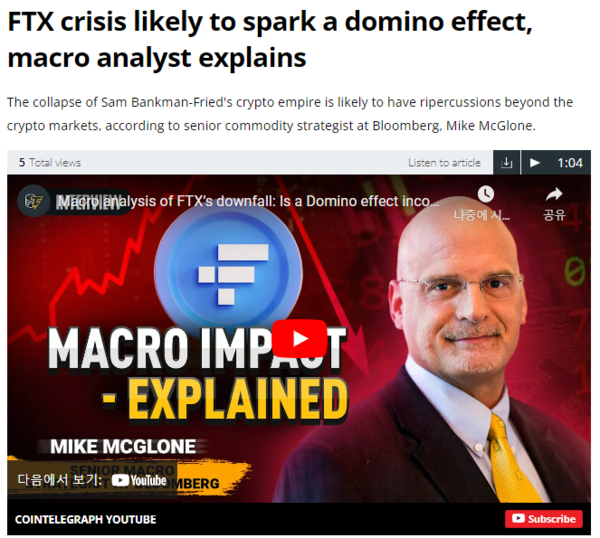12일(현지시간) 블룸버그 인텔리전스(Bloomberg Intelligence)의 마이크 맥글론(Mike McGlone) 상품 전략가가 코인텔레그래프와의 인터뷰에서 "보다 광범위한 자산 시장까지 도미노처럼 무너질 수 있다. 주식, 상품 시장의 하락 움직임도 가속화될 것"이라 전망했다.