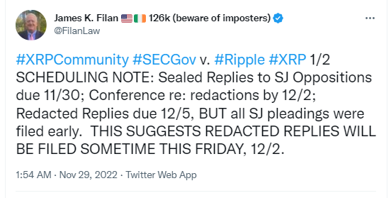 미국 증권거래위원회(SEC)와 리플의 '미등록 증권 판매' 소송을 지속적으로 추적해온 변호사 제임스 K. 필란이 트위터를 통해 "리플 소송 양 당사자간의 약식판결 신청(SJ Motions) 브리핑 제출 기한은 11월 30일(현지시간) 까지다"라고 전했다.