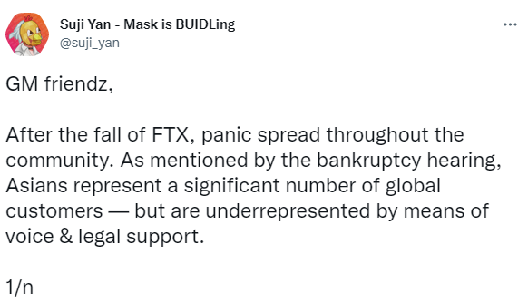 그는 "FTX 파산 이후 커뮤니티는 패닉에 빠졌다. 파산 청문회에서 언급됐던 것처럼, FTX 글로벌 고객 중 대부분은 아시아인이었지만 이들에 대한 법적 지원은 미비하다. FTX 사태가 마스크 네트워크에 영향을 미치지는 않았지만, 우리는 커뮤니티를 위해 미래를 준비하고 있다"고 전했다.