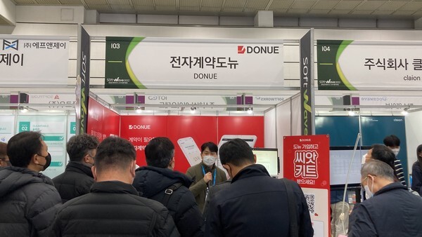 도뉴는 '덜 일하고 더 잘하는 방법, 전자계약 도뉴'를 테마로 QR코드를 통해 전자계약 서비스를 체험할 수 있는 이벤트존과 현장에서 바로 1:1 맞춤 컨설팅을 진행할 수 있는 상담존 등으로 부스를 꾸몄다.