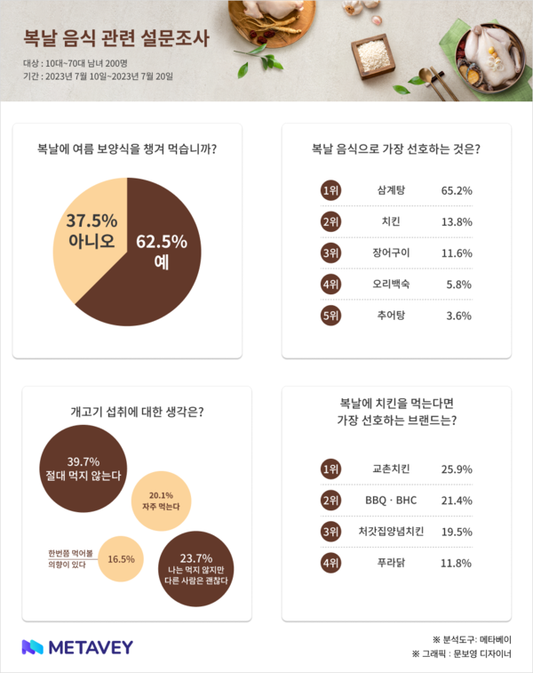 데이터 기반 리서치 기업 메타서베이(MetaSurvey)가 신개념 서베이 메타베이를 통해 7월 10일부터 7월 20일까지 복날 음식과 관련한 설문조사를 진행했으며, 10대~70대 남녀 총 200명이 응답했다.