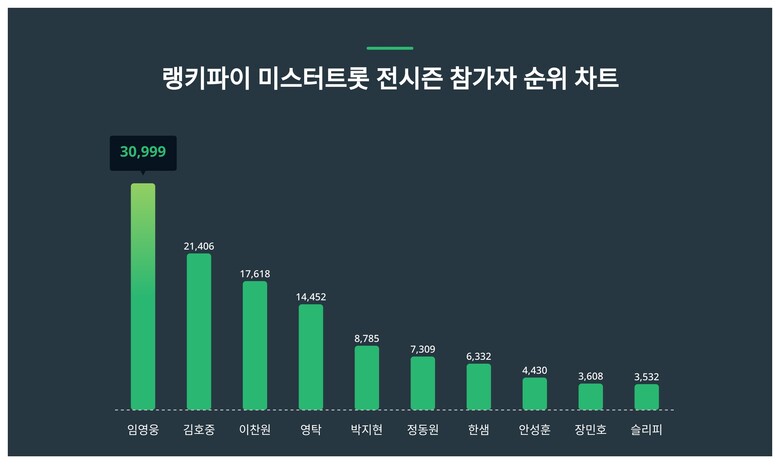 [CWN 김해남 기자] 랭키파이가 발표한 2024년 2월 3주차 미스터트롯 전시즌 참가자 트렌드 지수에 따르면 임영웅의 트렌드 지수는 30,999포인트로 전주보다 2,517포인트 상승하면서 1위를 차지했다.