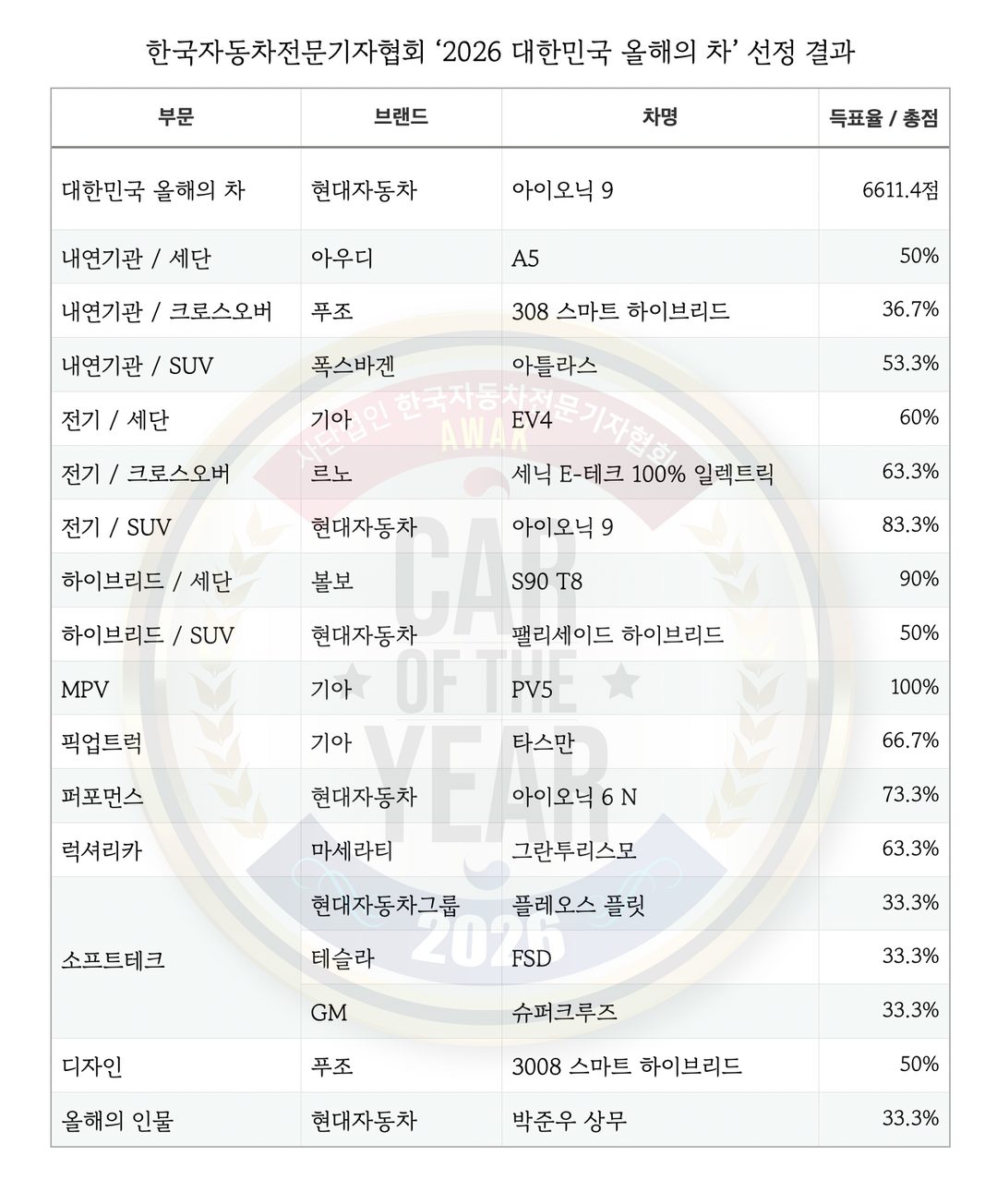 부문별 수상은 △대한민국 올해의 차 ‘현대자동차 아이오닉 9’ △올해의 내연기관 세단 ‘아우디 A5’ △올해의 내연기관 크로스오버 ‘푸조 308 스마트 하이브리드’ △올해의 내연기관 SUV ‘폭스바겐 아틀라스’ △올해의 전기 세단 ‘기아 EV4’ △올해의 전기 크로스오버 ‘르노코리아 세닉 E-테크 100% 일렉트릭’ △올해의 전기 SUV ‘현대자동차 아이오닉 9’ △올해의 하이브리드 세단 ‘볼보 S90 T8’ △올해의 MPV ‘기아 PV5’ △올해의 픽업트럭 ‘기아 타스만’ △올해의 퍼포먼스 ‘현대자동차 아이오닉 6 N’ △올해의 럭셔리카 ‘마세라티 그란투리스모’ △올해의 디자인 ‘푸조 3008 스마트 하이브리드’가 선정됐으며 올해의 인물에는 현대자동차그룹에서 N브랜드를 담당하는 박준우 상무가 선정됐다.