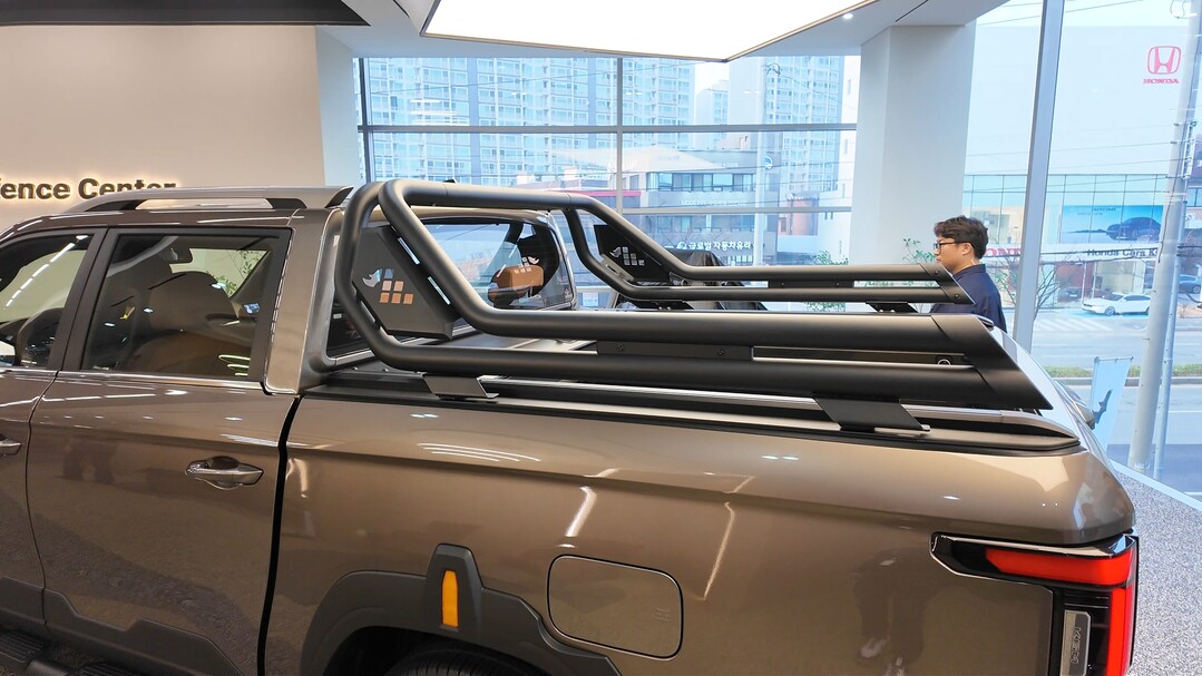 이루며 웅장하고 대담한 존재감을 뽐냈습니다. 특히 리어 범퍼 하단에 마련된 코너 스텝은 실용성을 강조하며, 화물 적재 시 편의성을 높이는 섬세한 배려가 돋보였습니다.