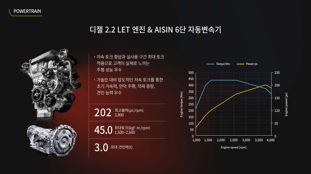 자동변속기와 결합된 2,157cc 터보디젤엔진과 KGM 수출모델에