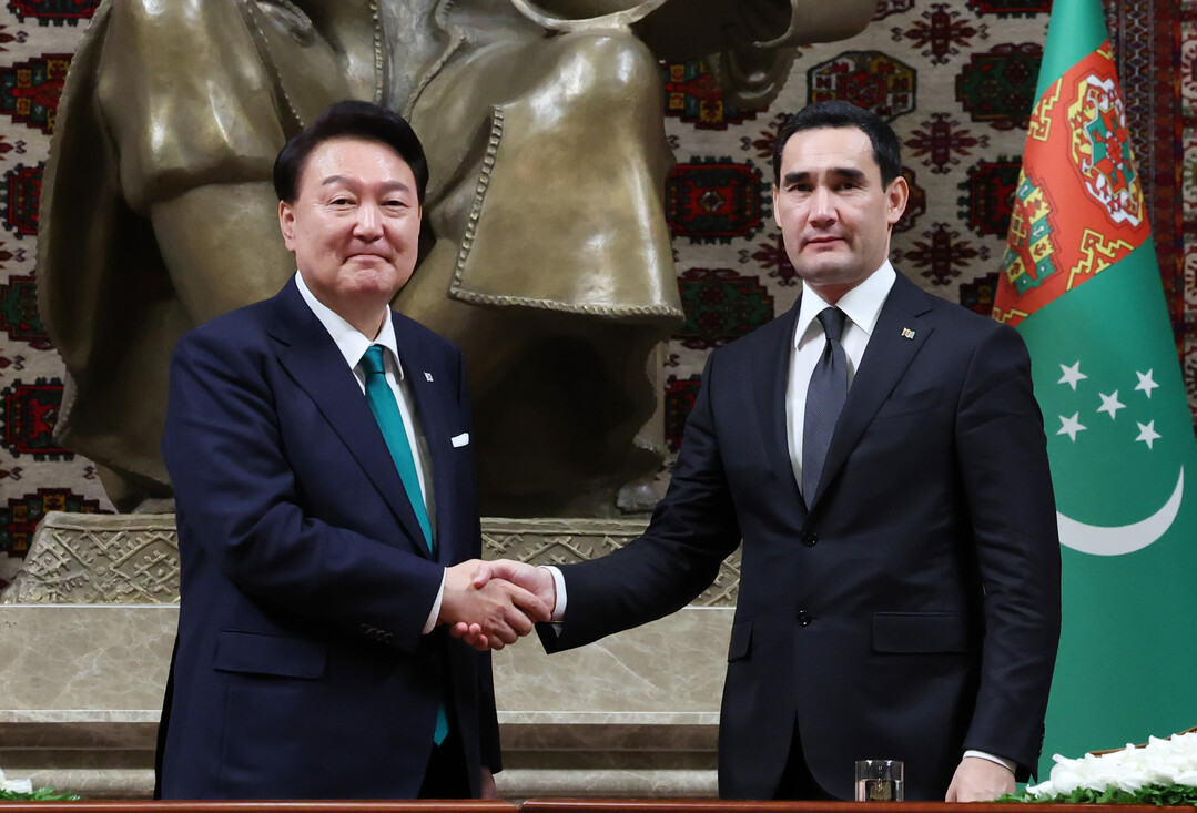 | ▲ 윤석열 대통령과 세르다르 베르디무하메도프 투르크메니스탄 대통령이 10일(현지시간) 아시가바트 대통령궁에서 열린 공동언론발표에서 악수하고 있다. 사진=뉴시스 |