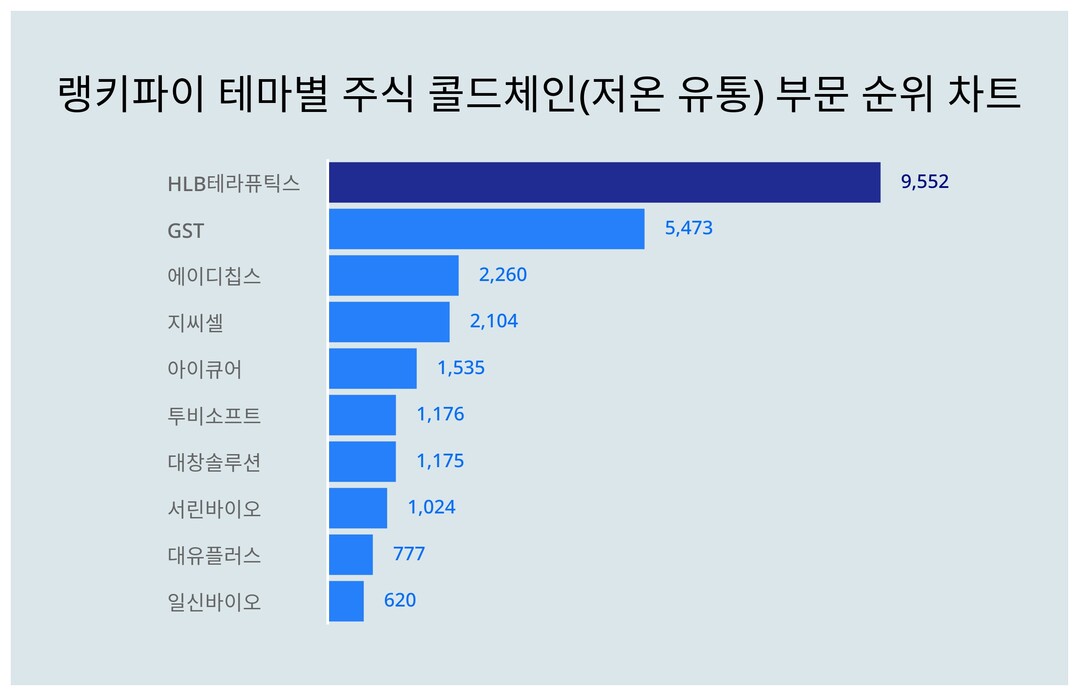 [CWN 김해남 기자] HLB테라퓨틱스가 테마별 주식 콜드체인(저온 유통) 부문 트렌드 지수 1위를 차지했다.