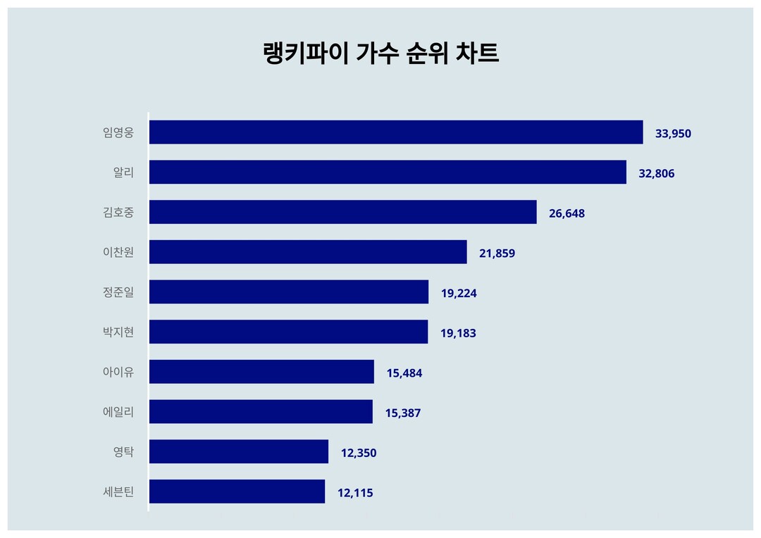 알리는 32,806포인트로 전주보다 13,892포인트 상승해 2위를 차지했다. 이어 김호중, 이찬원, 정준일, 박지현, 아이유, 에일리, 영탁, 세븐틴이 뒤를 이으며 3~10위를 기록했다.
