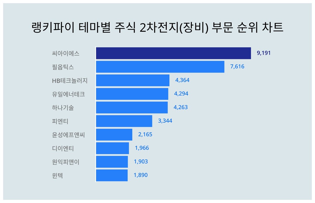 1위 씨아이에스 주가·2위 필옵틱스 주가·3위 HB테크놀러지 주가, 3월 4주차 테마별 주식 2차전지(장비) 부문 트렌드지수 순위 발표