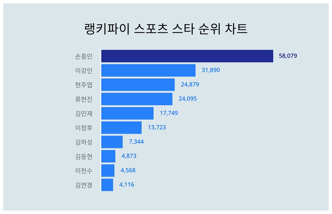 | 1 | 손흥민 | 58,079 | 38,576 | 19,503 | 50.6% |
