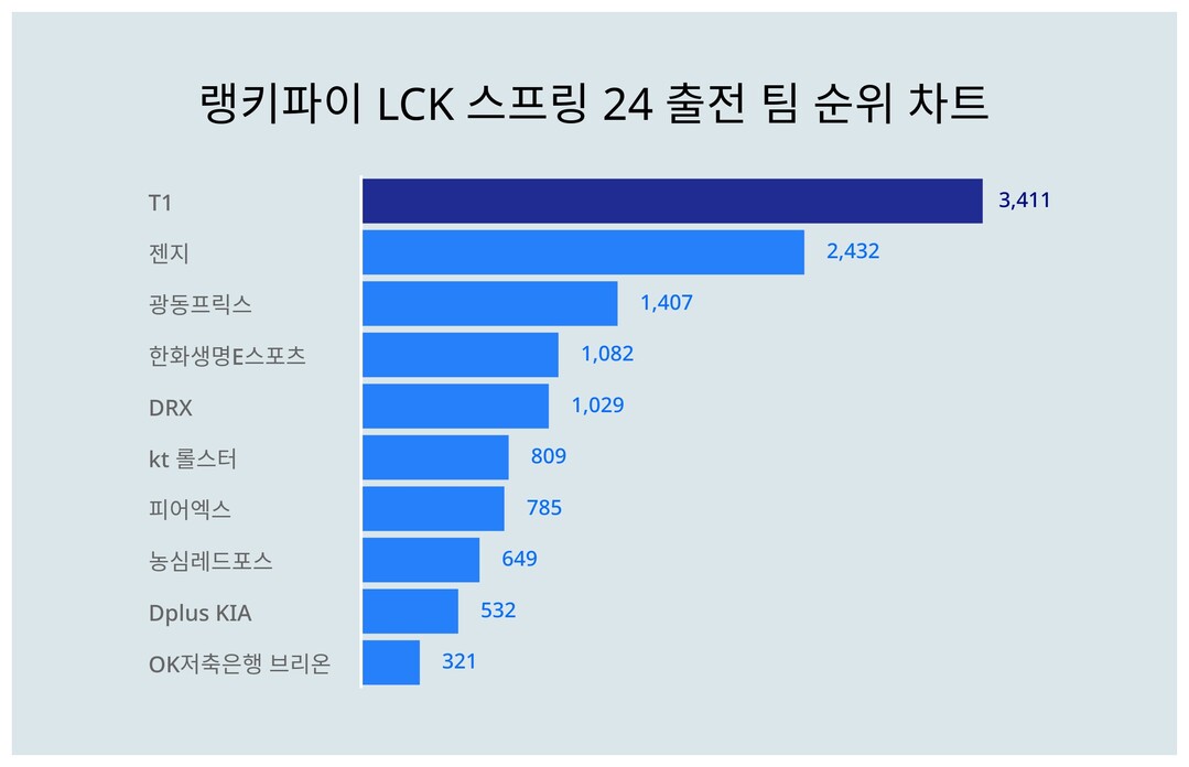 2024년 3월 4주차 LCK 스프링 24 출전 팀 랭키파이 분석 결과 1위를 차지한 T1은 트렌드 지수 3,411포인트로 전주보다 615포인트 하락했다.