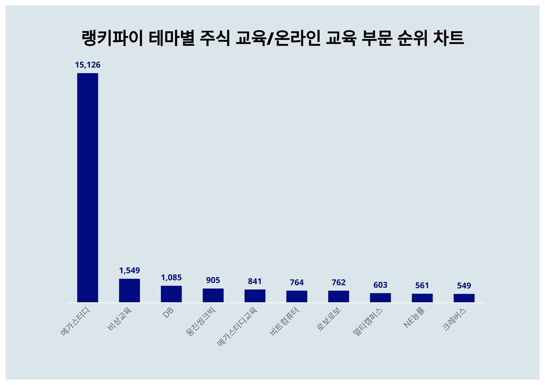 [CWN 김해남 기자] 랭키파이가 발표한 2024년 4월 11일 트렌드지수 분석 결과 테마별 주식 교육/온라인 교육 부문 트렌드지수에서 메가스터디 주가가 1위를 차지했다.