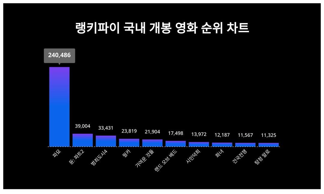 [CWN 김해남 기자] 랭키파이가 발표한 3월 4주차 국내 개봉 영화 트렌드 지수에서 파묘가 트렌드 지수 240,486포인트로 1위에 올랐다.