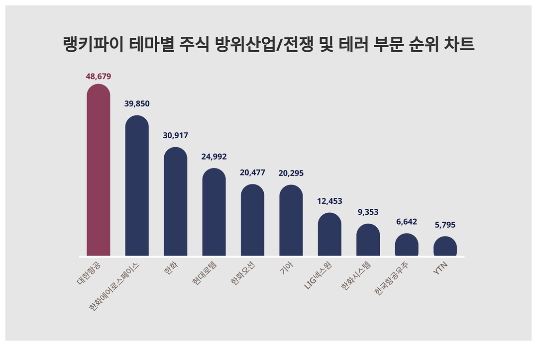 [CWN 김해남 기자] 랭키파이가 발표한 2024년 4월 2주차 트렌드지수 분석 결과 테마별 주식 방위산업/전쟁 및 테러 부문 트렌드지수에서 대한항공 주가가 1위를 차지했다.